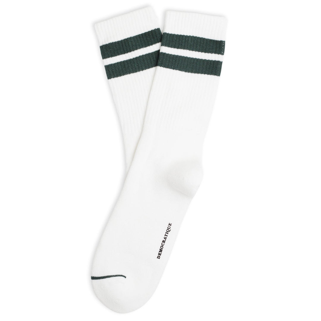 Løft din stil med Democratique Socks' ikoniske crew-cut rene og ensfarvede stribede sokker i Clear White/Forrest Green. Nyd den suveræne komfort af deres organiske bomuldsstof og fuld frottéfod, hvilket sikrer en uovertruffen bæreoplevelse. Vis din upåklagelige smag frem for verden med stolthed, og lad dine venner beundre dit sokkespil.