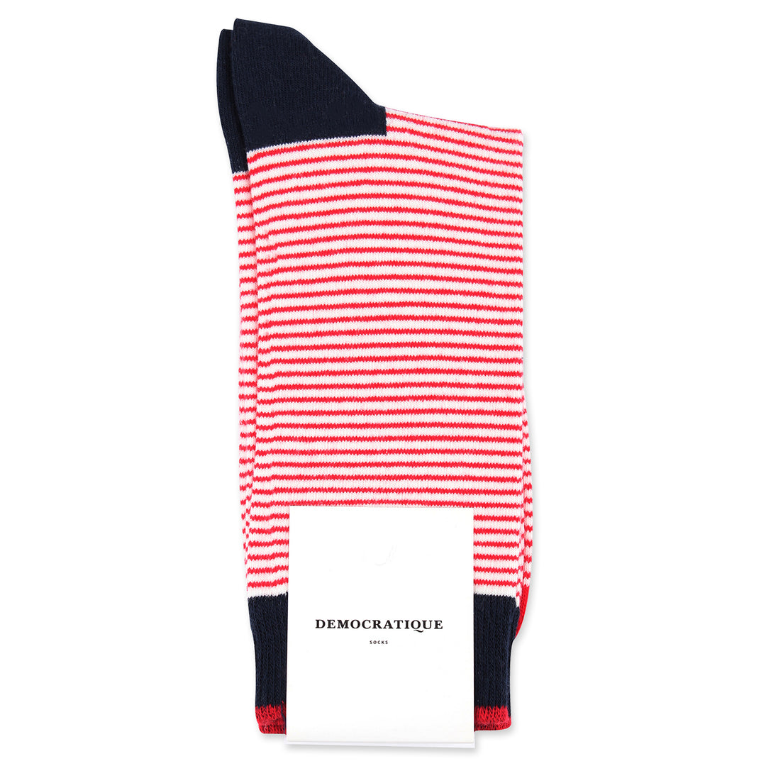 Democratique Socks Originals Mini Stripes er klassisk 1:1 stribet sok. Går til mange forskellige stilarter, men måske mest kendt for sailor looket. Økologisk kæmmet bomuld af høj kvalitet med 200 nålestrik samt håndforbundet tå.