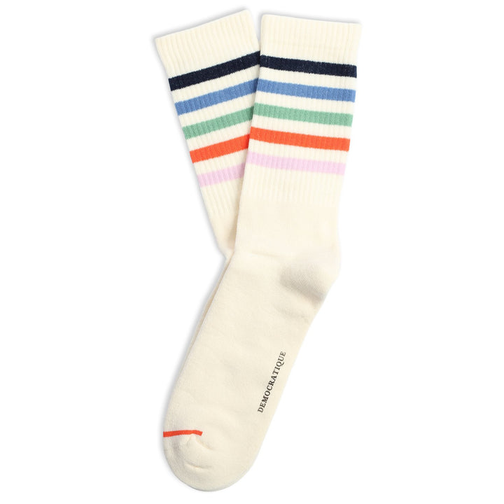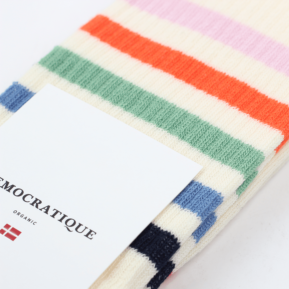Express your personal style and make a triumphant fashion statement with Democratique Socks' Off White / Navy / Cold Blue / Soft Green / Pumpkin / Cold Blossom Super Striped Crew Socks. Experience the ultimate comfort of organic cotton and a full terry foot as you proudly show them off to the world. Share your love for these socks with the hashtag #democratiquesocks and tag @democratiquesocks - get ready for a flood of likes! Elevate your style and feel luxurious with every step.