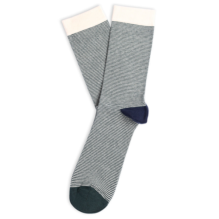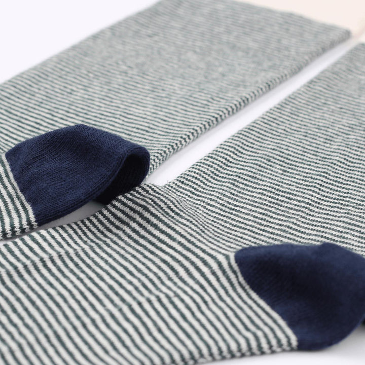 The ultralight stripes gives you an almost melange to solid color look from the distance. You have to get really close to see the very thin stripes in the socks from the Democratique Socks collection. Green, navy and off white gives You the perfect sock.