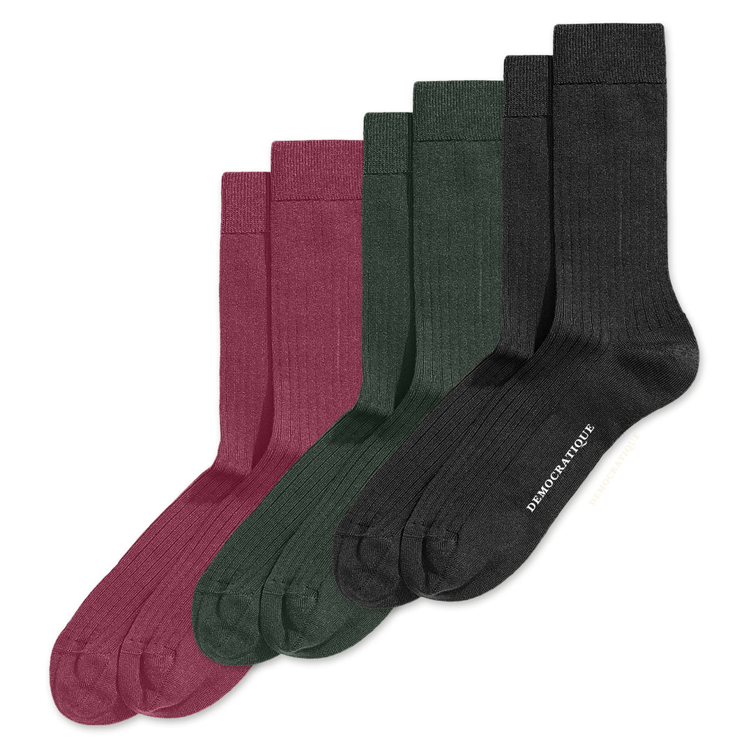 Democratique Socks Curated Pack 46 - 6 pairs, 2 Black, 2 Forest Green and 2 Bordeaux