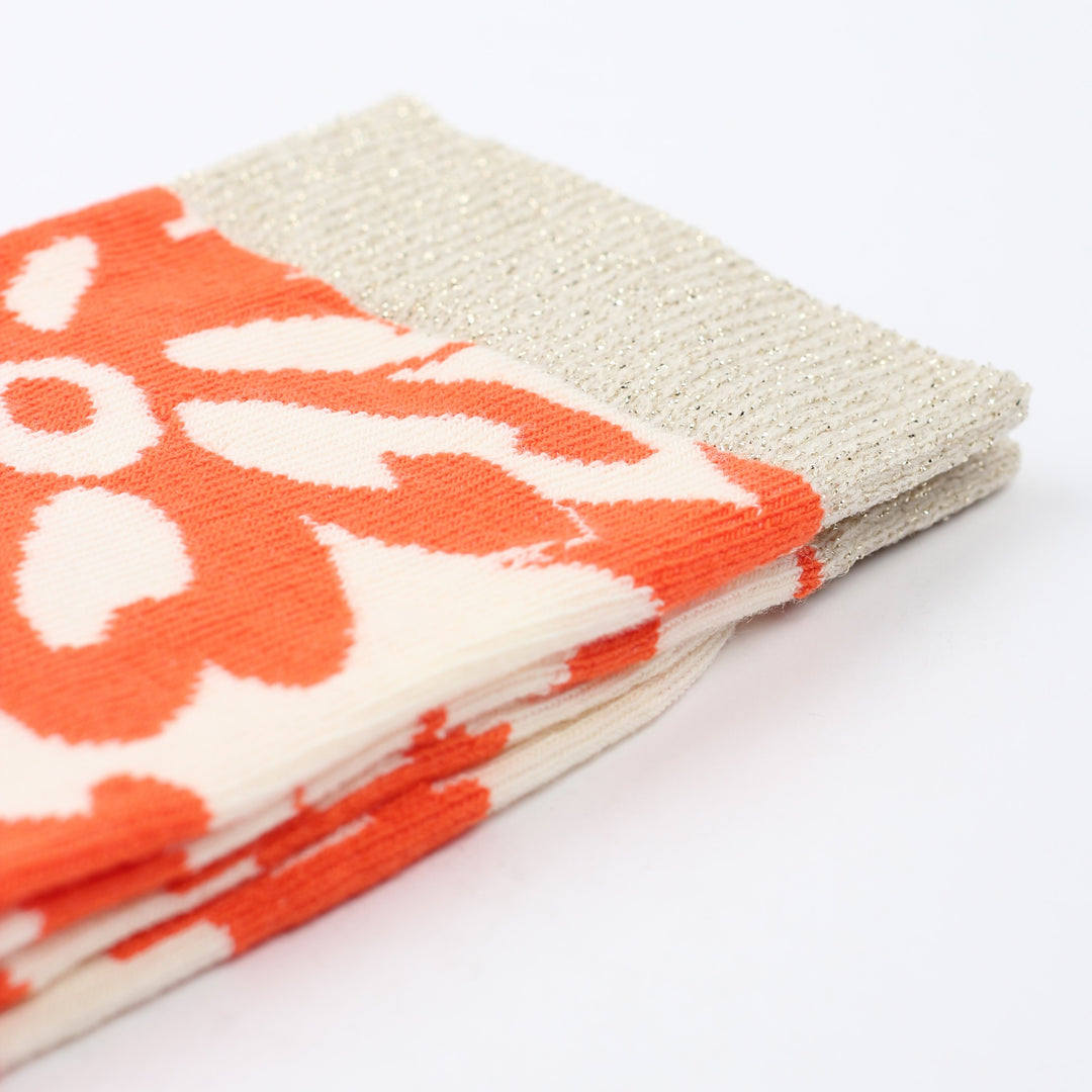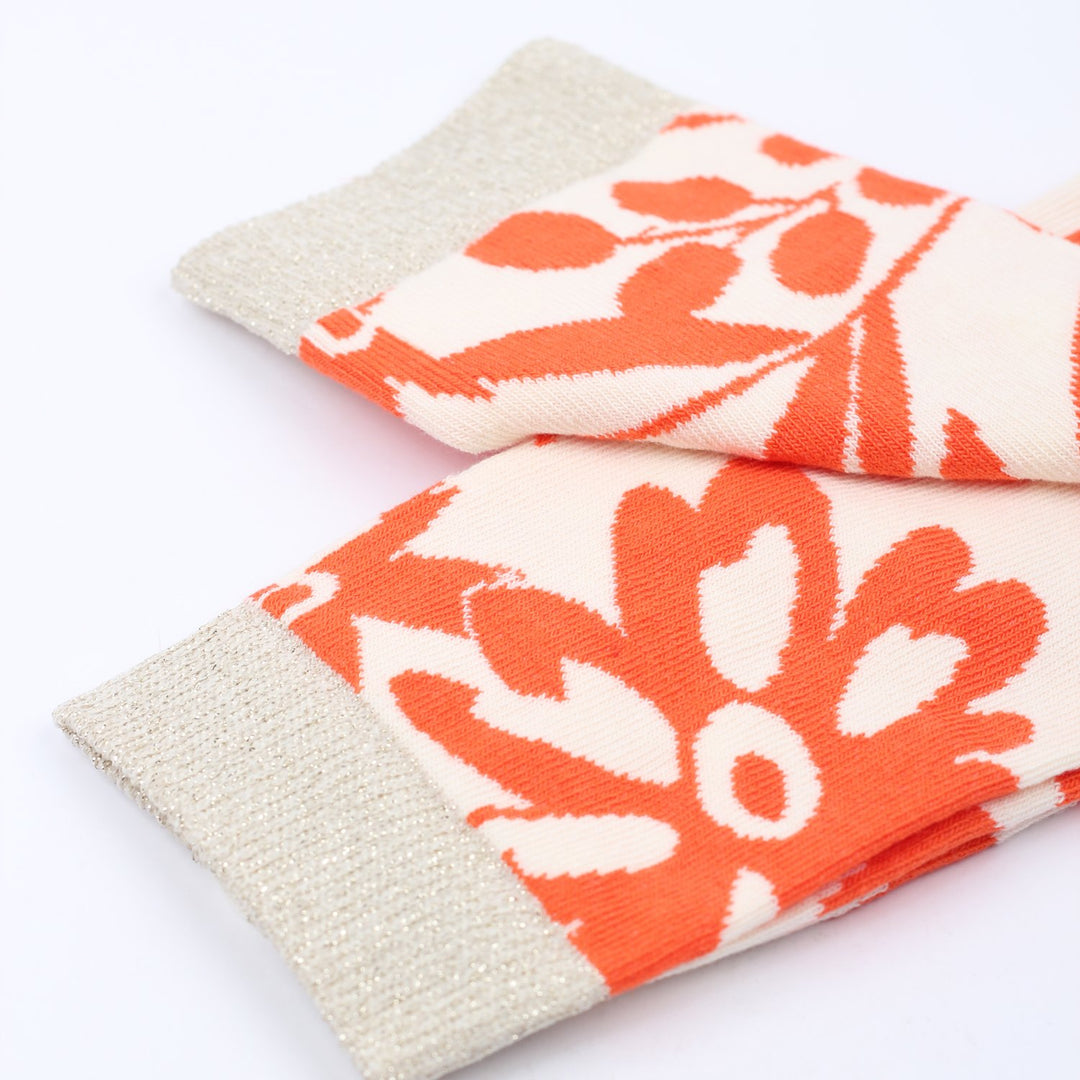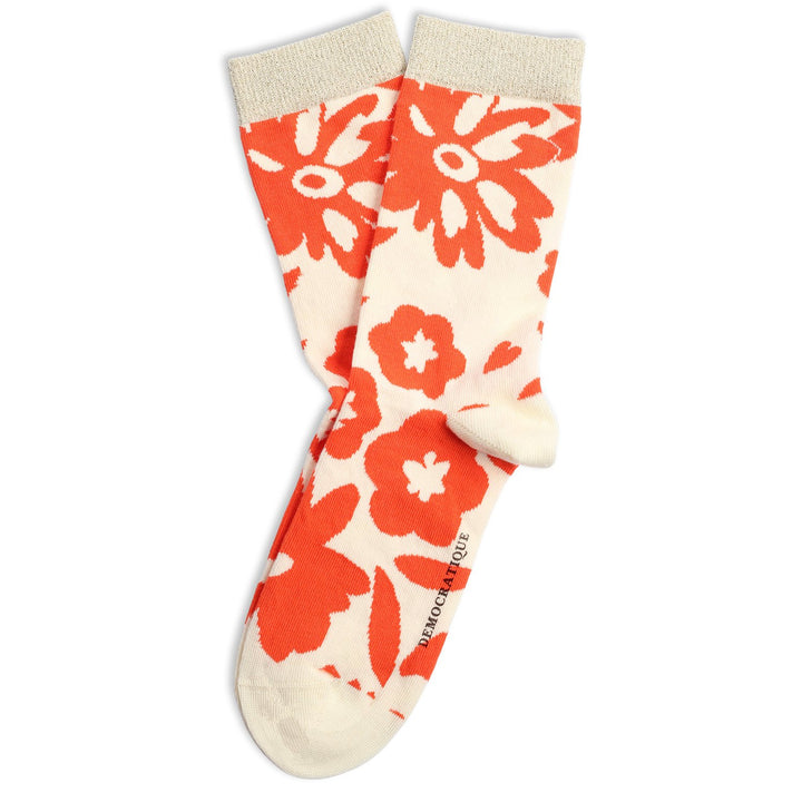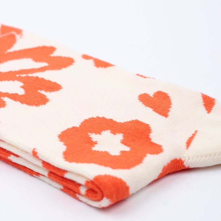 Indulge in the ultimate luxury and sophistication - discover Originals Femme Fleur Socks in Off White / Pumpkin / "Gold". Featuring exquisite flower and heart graphics by Democratique Socks, these socks are made from organic cotton for both comfort and sustainability. Immerse yourself in the lavish texture against your skin and enter a world of timeless elegance and refined aesthetics. Let Democratique Socks for women revolutionize your approach to fashion, functionality, and eco-friendly choices. Every intricate detail echoes your dedication to style and sustainability. Experience the epitome of refinement with Democratique's Originals Femme Fleur Socks.