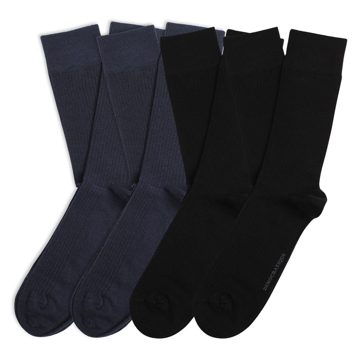 Experience Originals Fine Rib in a convenient 4-pack—two pairs in classic black and two pairs in rich navy—all crafted with the same meticulous attention to detail. Each ribbed sock is knit from high-grade organic cotton on 200-needle machines and finished with a hand-linked toe for an impeccably smooth fit.