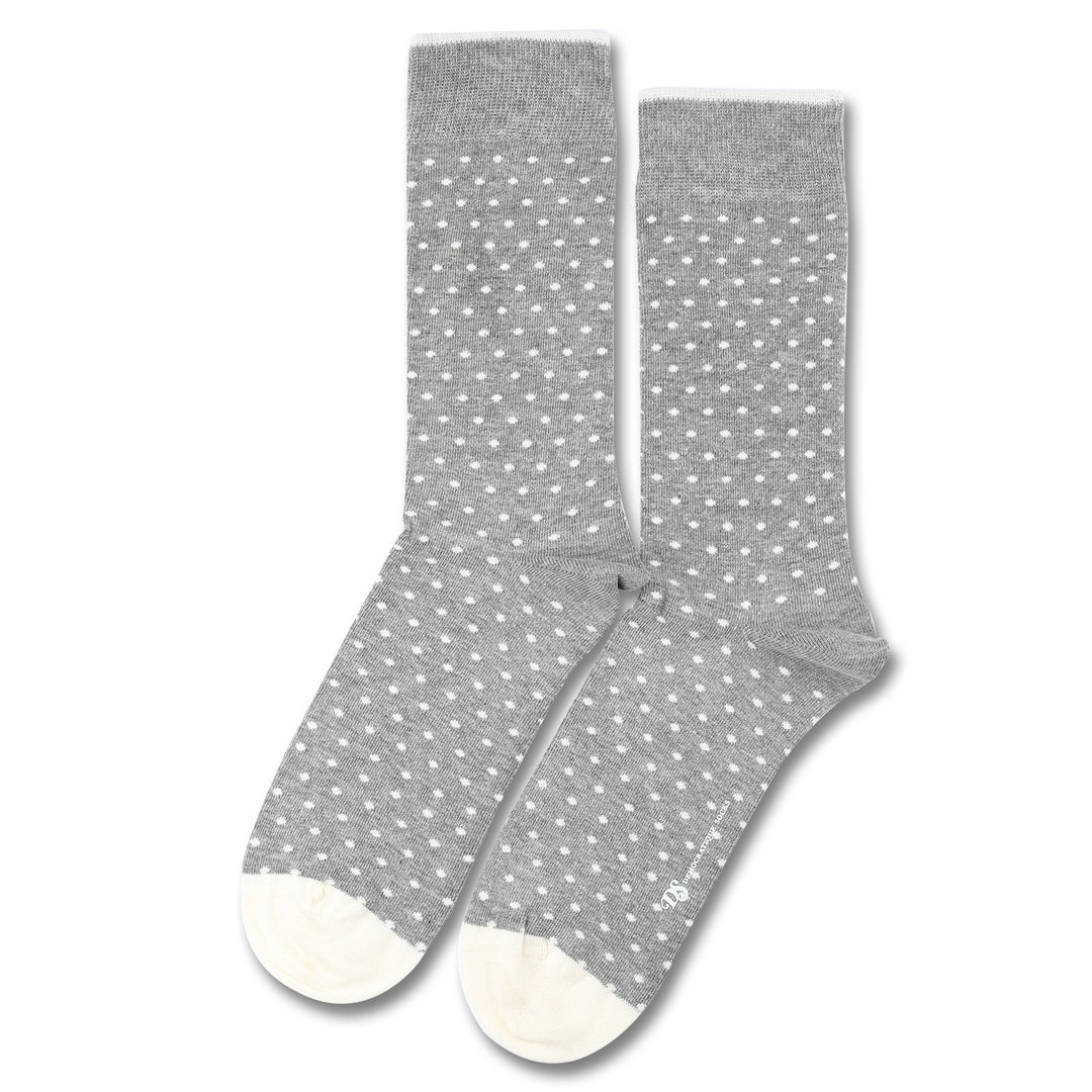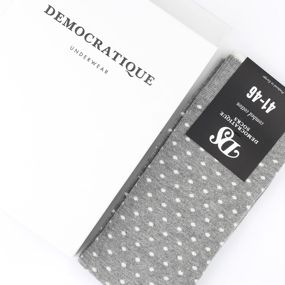 Polka dots have a timeless appeal that first captivated 19th-century British fashion trailblazers and now grace today's runways. Democratique Socks Polkadot Grey / Off White perfectly combine 168 needles and handlinked toes with premium organic cotton for a unique look. Available in a NOOS selection, they'll amp up your everyday wardrobe with chic, impeccable flair. You'll love the luxurious fit and feel of these socks, perfect for dressy and casual shoes alike.