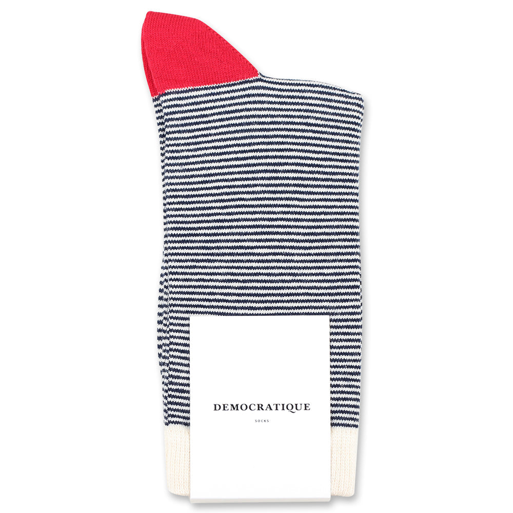 The Democratique Socks Originals Ultralight Stripes Navy / Off White / Red embody luxurious organic cotton striped socks, constructed to offer unbeatable comfort and quality. Crafted by one of the world's most talented factories, these stylish socks provide an elegant way to add a splash of color to your ensemble. Raising the bar of excellence and luxury to a never-before-seen height, these socks will upgrade your attire, ensuring a snug fit and stylish flair for any sneaker or dress shoe.