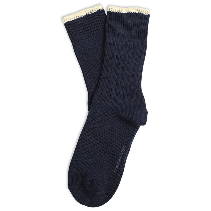 Immerse yourself in the unmatched texture and flawless craftsmanship of Democratique Socks' Relax Chunky Rib style, featuring a high-quality knitting technique and accent colors. Designed to provide warmth during winter's chilly days yet lightweight enough for year-round wear, these Navy / Off White Supermelange socks, meticulously crafted from organic cotton, emanate opulent quality and refined elegance.