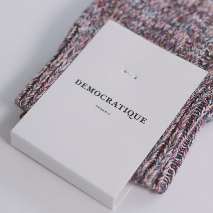 Get these unique navy blue, red and white twisted yarn supermelange socks in organic cotton from Democratique Socks and wear them with pride. The joy will come for sure when you feel the quality and craftsmanship. Please share your everyday sock pictures on Instagram and tag us with @democratiquesocks and #democratiquesocks. That will be a 100% like from us.